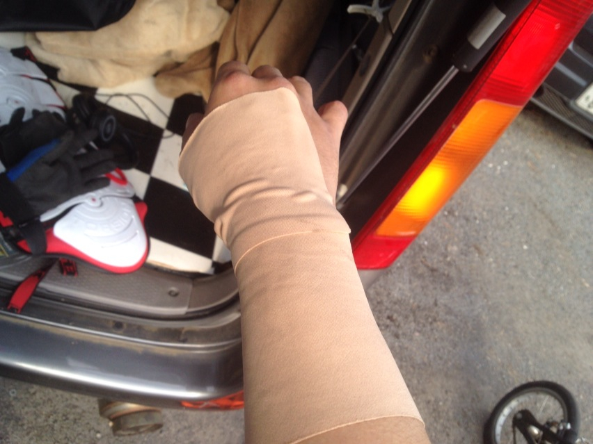 ところが、ツナギを脱いだ辺りで何やら右手首からヒジに向かって腕の外側に違和感があった。