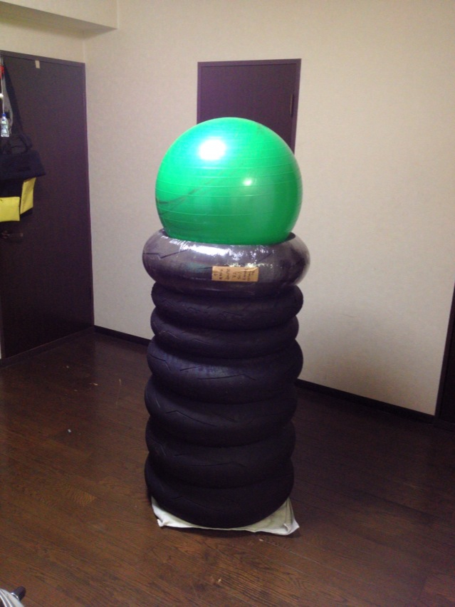 VFRのタイヤとは別に積み上がってる一昨年の600ccで使ってた練習タイヤ…バランスボール載っけたらオブジェ化したf(^_^;)
