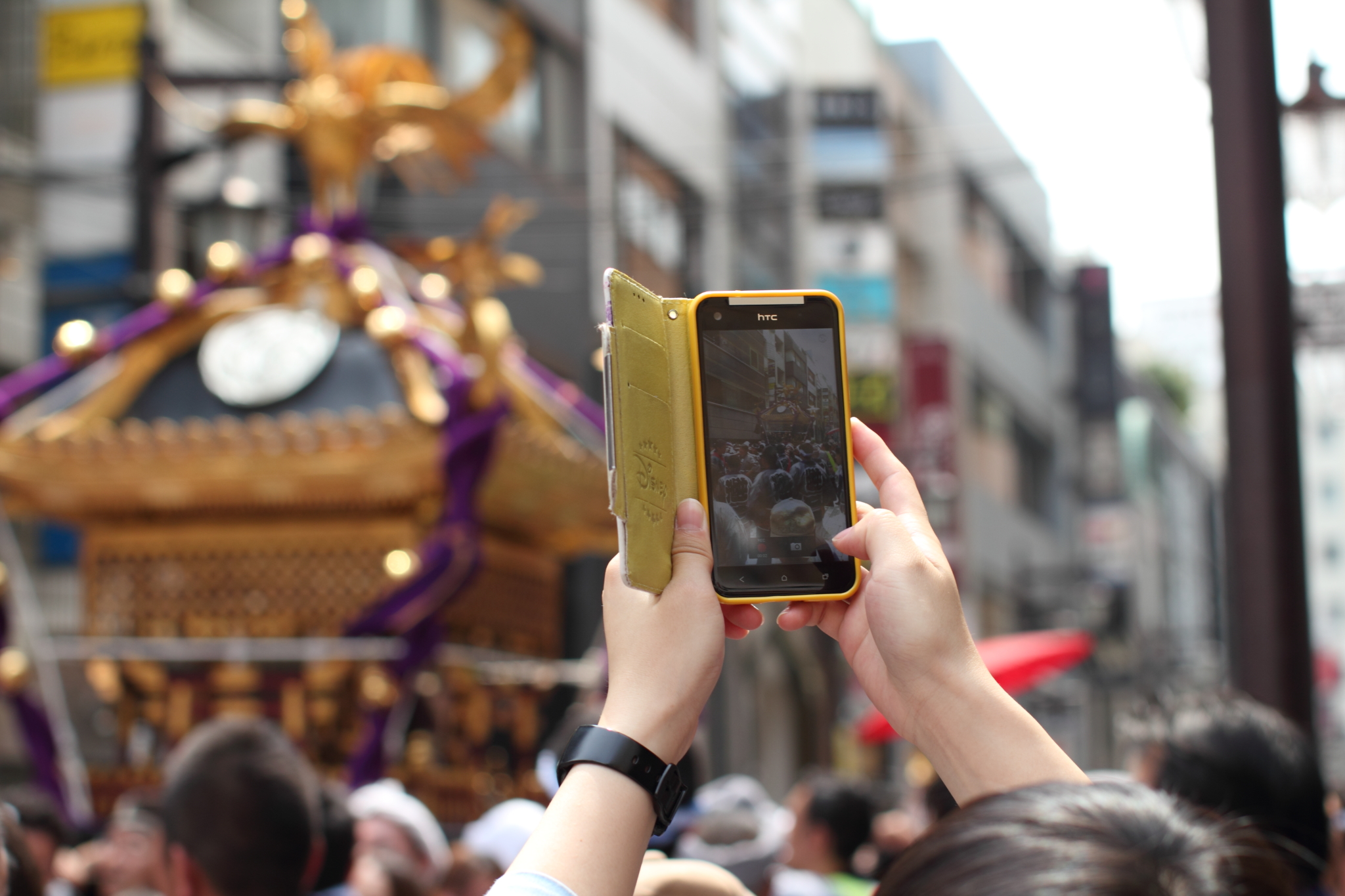 何枚も何枚も撮ってやっと良い感じの御輿のボケっぷりとスマホ画面の対比!