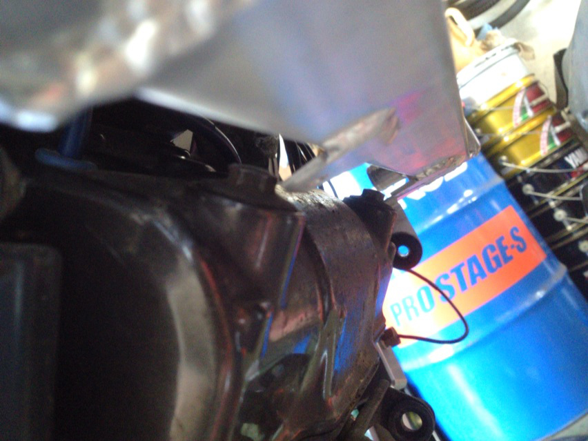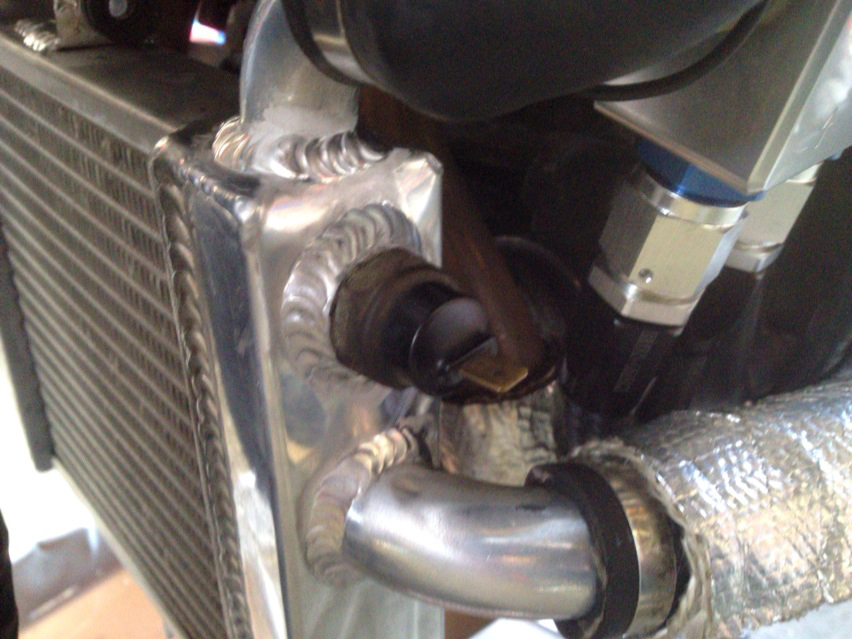 下側ラジエターのファンのセンサーを取り出す部分のフタについてたパッキンが信用できないっていう社長判断で、ノーマルのセンサーを持って来て着けた。