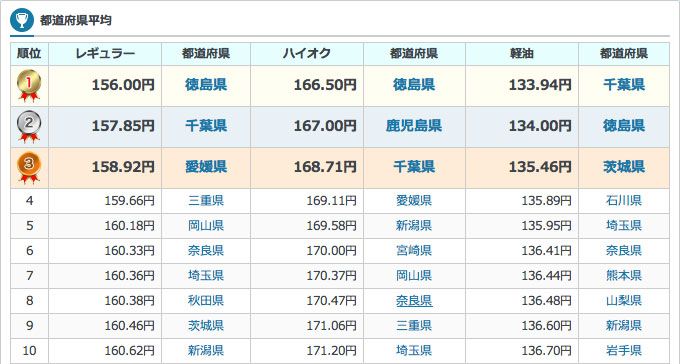 すると、ガソリン価格都道府県平均っていうページを発見して、各都道府県の燃料平均価格のランキングが載っていた。