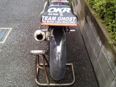 で、一昨日の桶スポ練習の時のコトなんですけども、良い感じに練習を終えて気分良く片付けをしていて、前後スタンドを掛けてタイヤに着いた石を払い落として、新品のタイヤカバーを鼻歌なんか鼻ずさみながら巻いていましたらば、ブチっ!っていう音がして後ろにずっこけた…。