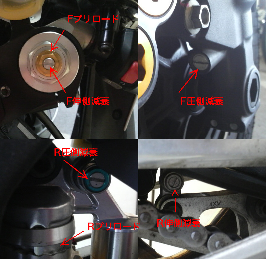 ついでなんで前後の伸側圧側それぞれのいじくるトコはココって写真。