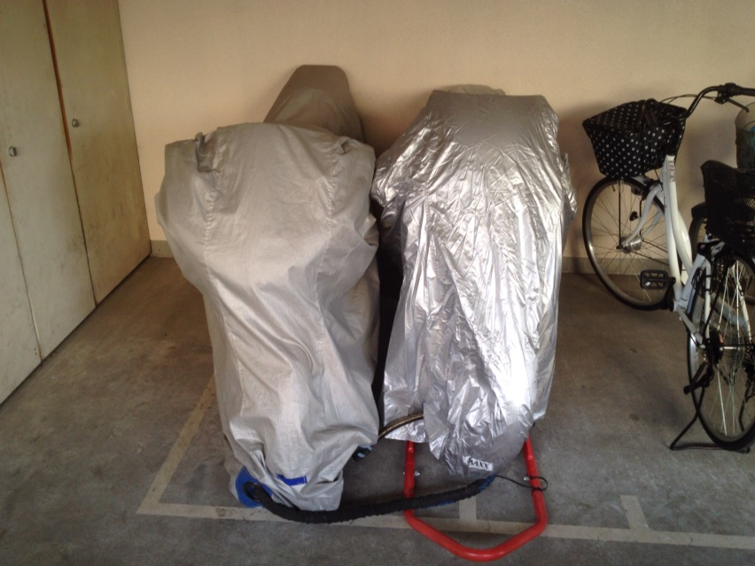 なので、一応シートカバーを買って来て被せて、R1と極力接近させてフロントホイールをワイヤーロックで繋げておいた。