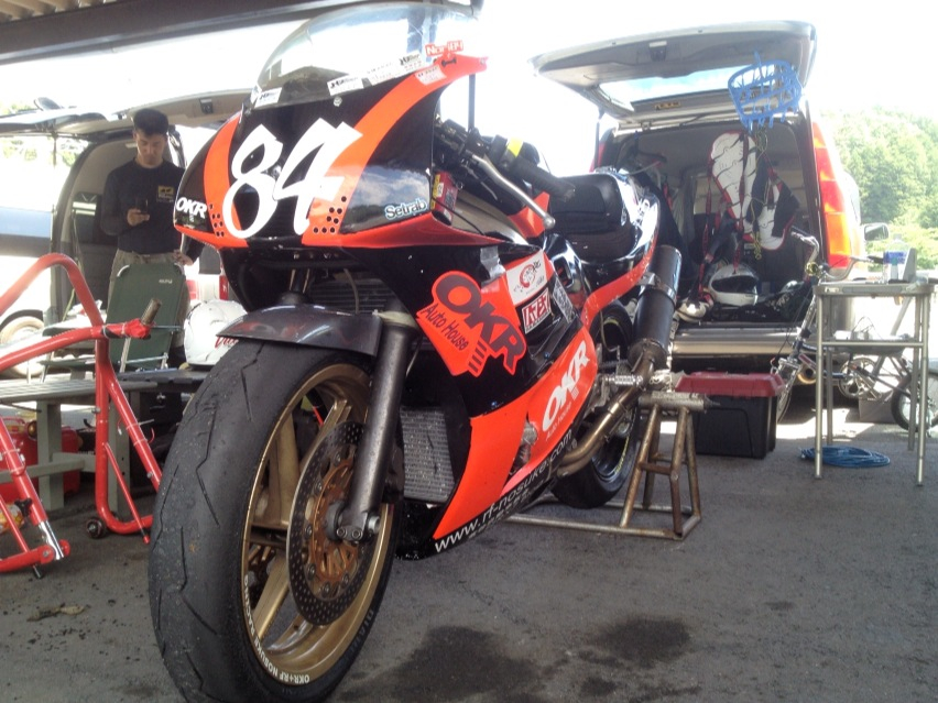 アンダーカウルとコースを見てもオイルを噴いてる様子はないし、クラッチを握ったままになっているVFRはどうやらエンジンが掛かっていてアイドリングしている。そのままピットレーンに入って、恐る恐るアクセルを煽ってみるとリアバンクからガラガラと嫌な音がする。