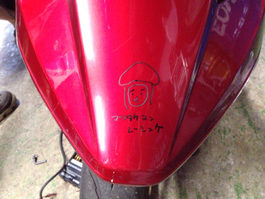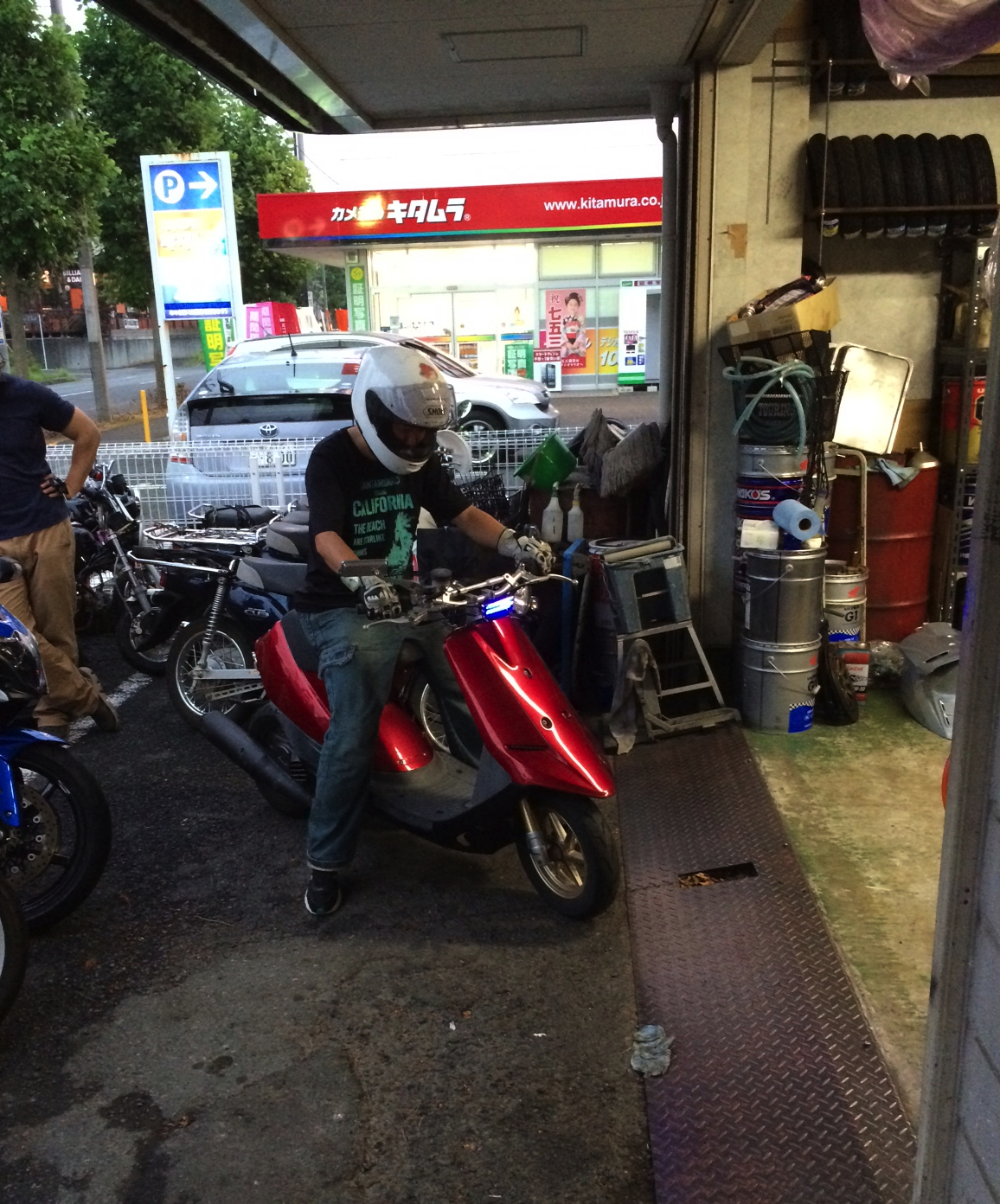 昨日OKRに社長の仕事の邪魔をしに行ったらハットリが何やらピットでいたずらしてたんですけども、何してたか?って言えば、通勤用のスクーターを弄ってた。