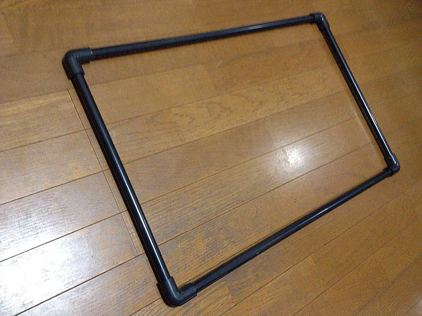 パイプをもう少し捻って持ち手を作ろうかとも思ったのだけど、プラダンの外にパイプで枠にするってことは、考えようによっては外周が全部持ち手みたいなもんなので、良いかな、とf(^_^;)