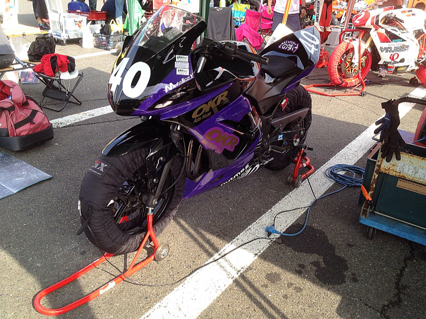 僕は出れるバイクがないのでお手伝いですけども、OKR社長と一緒にししまるさんのピットクルーでFT2。