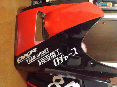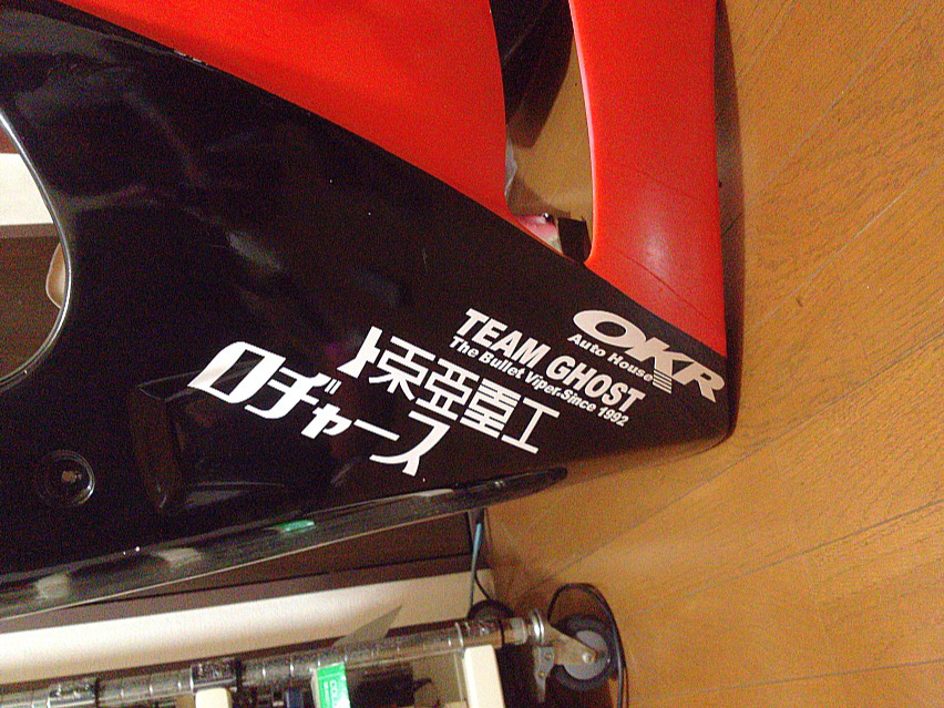 少し前にハットリと話してた時に、『やっぱり僕らはGHOSTのBulletViperなのだし、レースする時にも貼ろうぜ♪ってか今まで貼ってなかった方がおかしいのよな(笑)』って、今更ながら気がついたんで、アンダーカウルにはお世話になってるOKRのステッカーに続いて本来の自分のチームのステッカーを貼った。