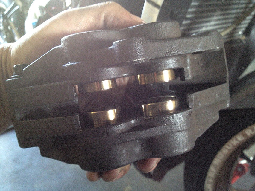 キャリパーを外して見るとピストンにだいぶ汚れが付着してて、そりゃぁ動きも悪くなりますよ…って。