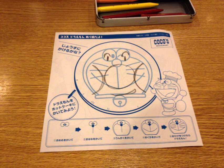 ところで全然関係ないですけども、この前cocosに肉を食いに行った時に、OKRの姫2号(推定小4)と王子(推定保育園児)がいたからか、案内されたテーブルにドラえもんの塗り絵の紙とクーピーみたいなのが置いてあったんですよね。