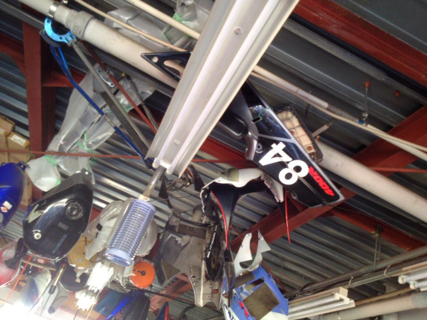 で、僕の練習カウルはと言えば、OKRのピットの天井にひっついてんです。