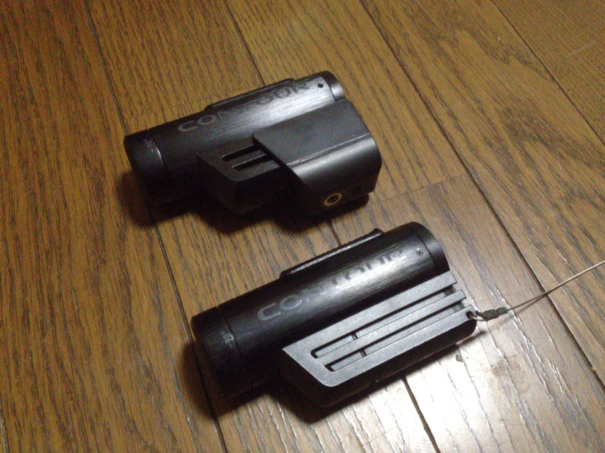 この写真の上のが今回買ったヤツで、溝の部分に変なのがついてるのがジャンクの理由なんですけども、Contour ROAMは元から三脚用の穴がついてるので本来はいらない上に、着けたら外せないとかどんな嫌がらせなのかと…。