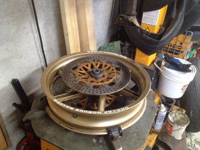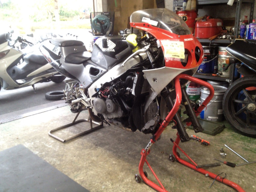 前後タイヤを外して浮遊中のVFRを見てたら、串で刺された豚の丸焼きを思い出した。