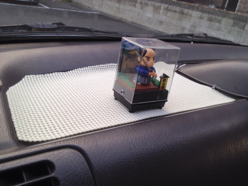 太陽電池で頭と刀をブンブン振り続けるのだけども、ダッシュボードに置いておくと滑って飛んで行ってしまうので、良くある滑り止めのシートがロヂャースで100円とかだったのを見掛けて買ってみたら、信じられないくらいピタッと、それはもう接着したみたいに留ってる。