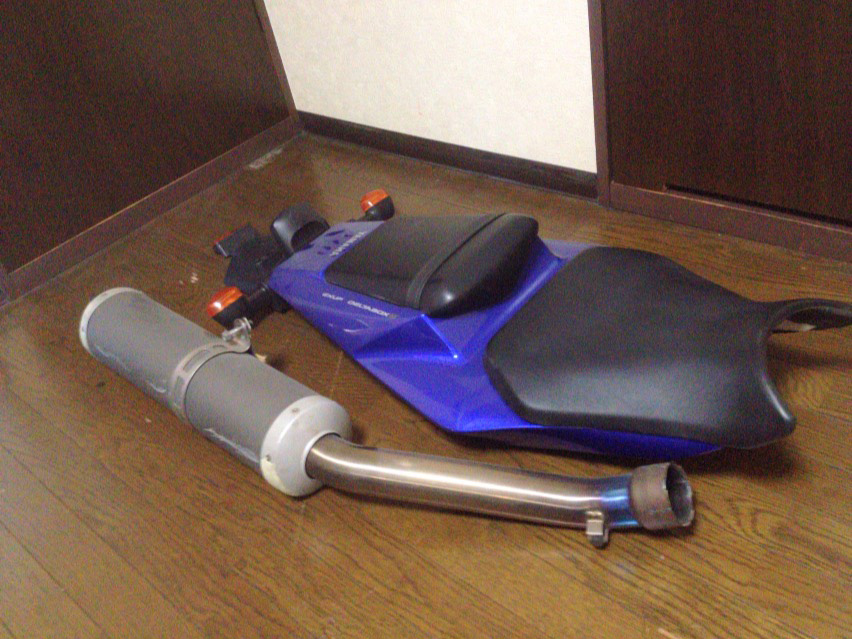 シート2つと泥よけ周りは収納の中で更に箱に入っていたので綺麗なのだけど、シートカウルと純正マフラーは謎の電話ボックスの上に置いてあったのでホコリがパネェ…。