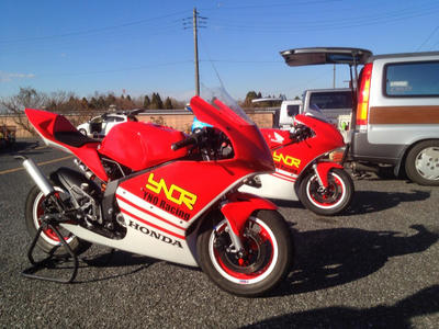 数年前からハットリが仲間数人でガレージを借りてバイクを安く買って来て、修理したりゴニョゴニョしたりするYNO Racingっていう集まりがあって、これまた数年前から富士の6時間耐久に出る!!って言ってハットリんトコのボスがほぼ1人でコツコツと作って来た2台のNSR50。