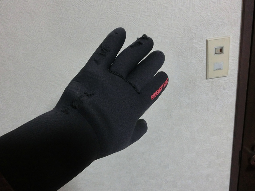モコモコグローブの左手も甲から小指薬指の辺りがベロベロになってるけど、僕本体は無傷。