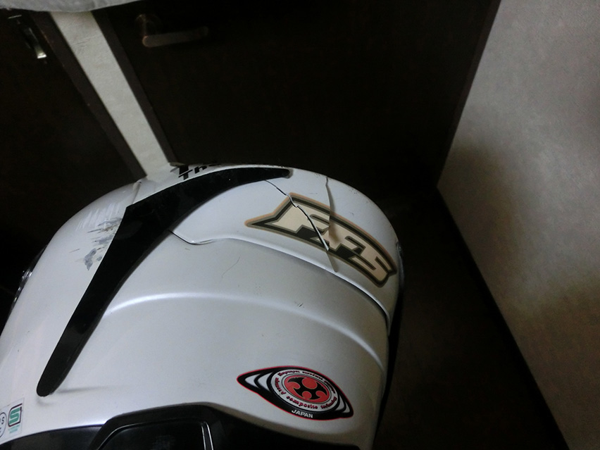 街乗り用ヘルメットは左側頭部とディフューザーにダメージを受けてるけど、冬用ジャケットの首回りと喉の辺りからの風の進入を防ぐ前掛けみたいなやつでガチガチだったのと合わせて頭も首もダメージを受けないで済んだ。