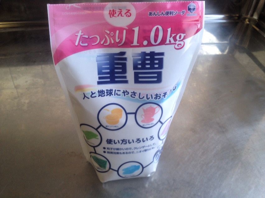 で、頻繁に掃除してるならともかく、換気扇のフードとかフィルターってちょっと気を抜くとベッタベタになって、それを見て更に面倒になって掃除しなくなってしまうんですけども、数年前オレンジオイル系の洗剤を試したら面白いように油汚れが取れて、それ以降常備してるんですけども、今回はちょっと実験で使った重層がたくさん余ってたんで、重層で油汚れが取れるっていう噂を試してみることにする。