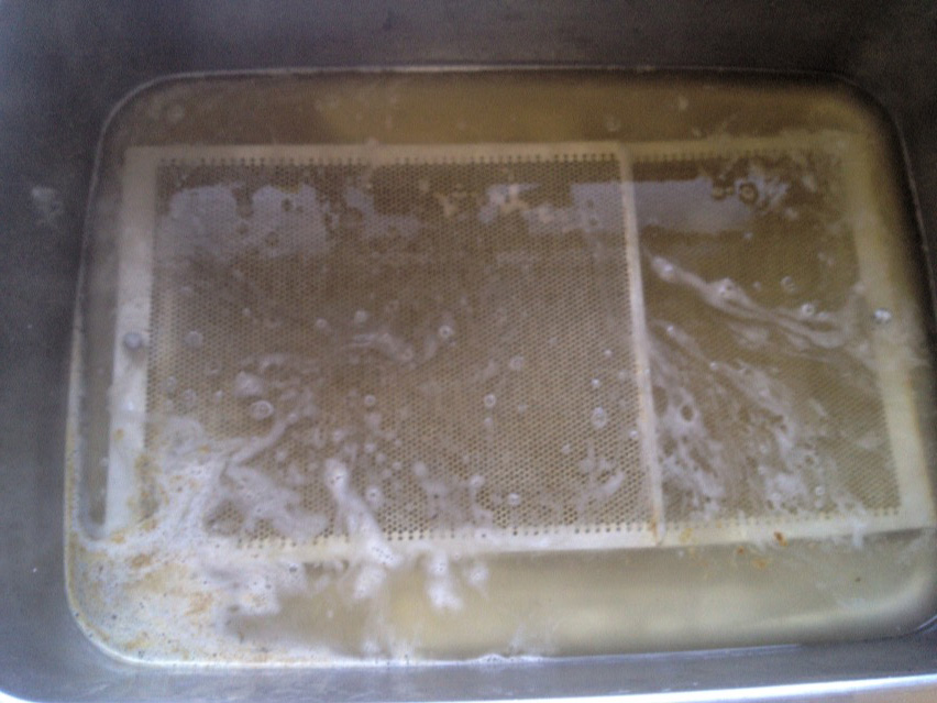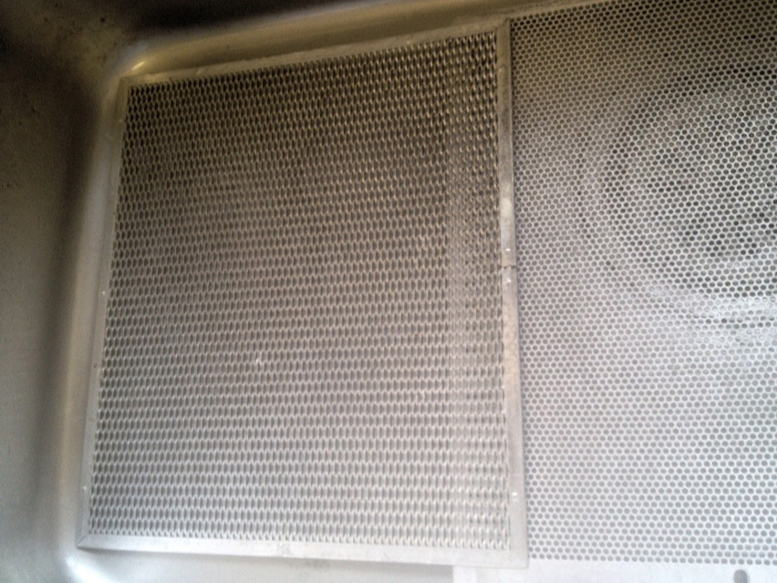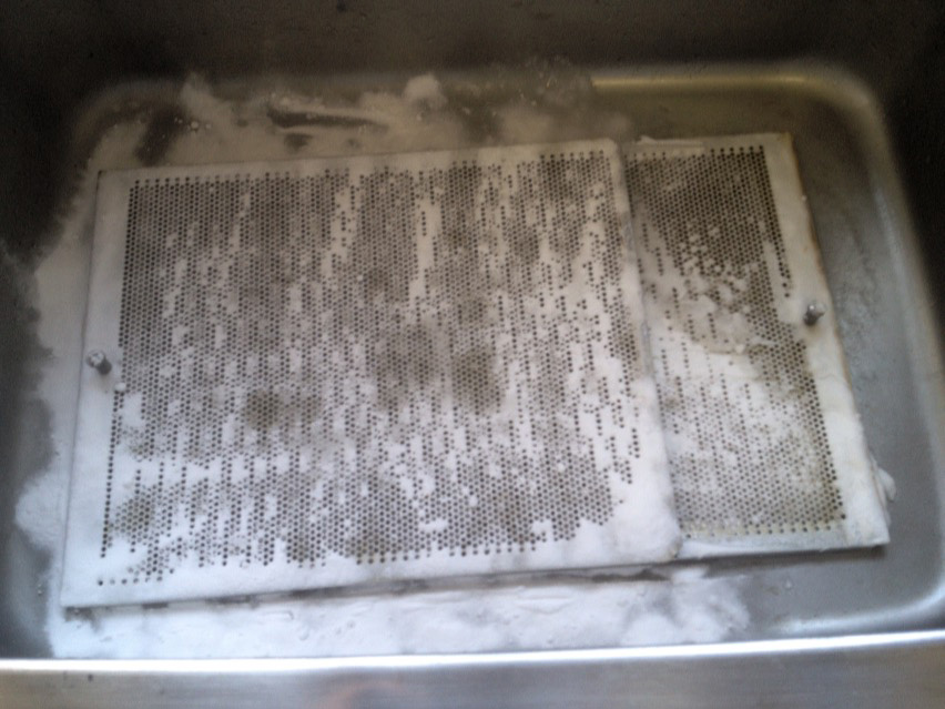 ちなみにですね、へそ曲がりな自分としては、別に重層じゃなくても普通の中性洗剤でも落ちるんじゃね??ってことで、中性洗剤を掛けてナイロンブラシで擦ってみたフィルターがこれ。