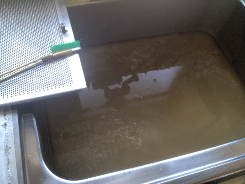 表面の塊の油汚れなんかは熱湯を掛けた瞬間に剥がれて浮いてくる。