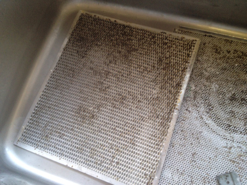我が家の換気扇はプロペラみたいなのじゃなくて、スクーターの空冷ファンみたいなヤツで、その前に金属のフィルターがくっついてるんですけども、そいつが油を吸い寄せてエラいことになってる訳ですよ。