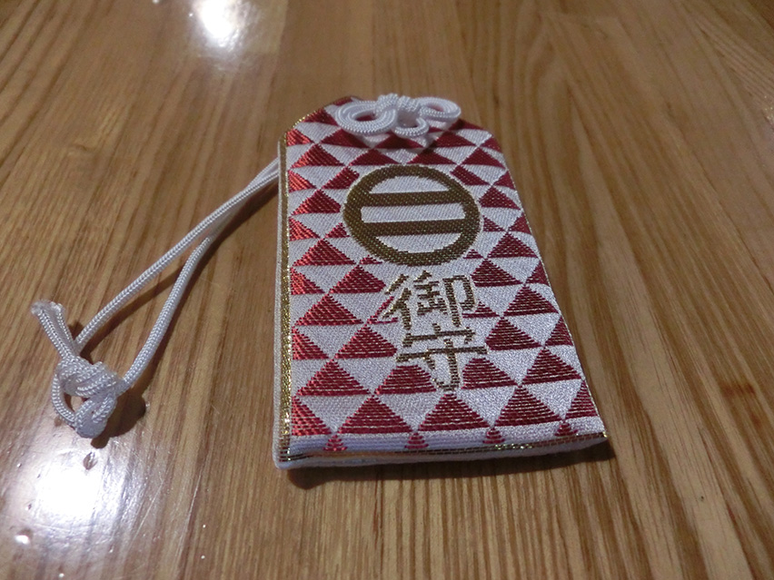 で、お賽銭どころの横でお守りが売っていたので1も2もなく厄除のお守りを買うんですけども、ここはお守り本体とお守り袋が別で売られていて、何やら可愛い売り子のお姉さんにいろいろ説明してもらって、厄除のお守りと4種類のうちピント来た袋を購入。
