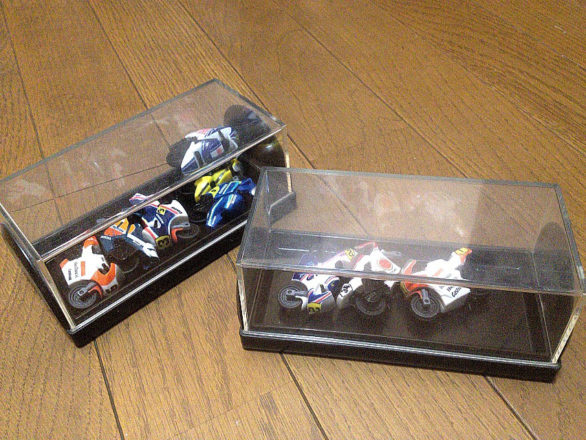 どうも何歳になってもこの手の食玩に釣られてしまうんですけども、普段観賞用のケースなんか買わないのに何故かこの時だけは買って来て飾ってたお陰で、ミニミニバイクどもは綺麗なままでしたf(^_^;)