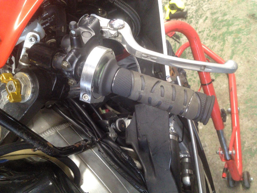 そんで苦肉の策というか、藁にも縋るってヤツでおフランスから個人輸入した親指アクセルなんですけども、おフランス人のセンスなのかなんなのか、左側のグリップもセットで交換するようになっていたんですよね。