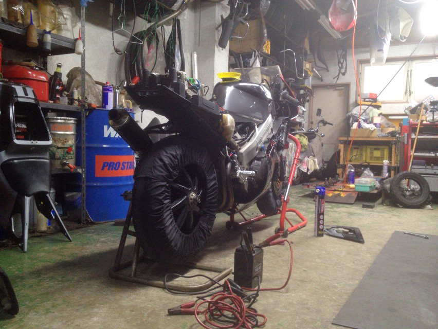 今回のR1の事故もそうですけども、バイクにダメージを与えてしまった場合に精神的な苦痛が増えるのが耐えられないので普段バイクを擬人化っていうか、生き物に対するような愛情を持つのを嫌う自分なんですけども、日本には八百万の神様在住なので、そういうこともあるのかもな…なんて思っていると、オイル交換を終了してお客さんにバイクを引き渡した社長がピットに戻ってきて、『今普通にエンジン掛かっちゃったら走りに行っちゃうからバイクが止めてるんじゃないの?』って女将さんとまったく同じことを言うんです。