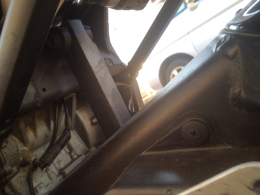 まず社長に手伝ってもらって、っつぅか社長がほとんどやってくれたんだけども、前後スタンドに掛けて真っすぐ立たせて、大まかにパーツを外して行く。
