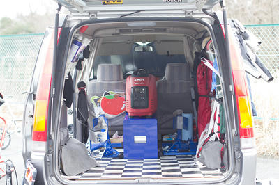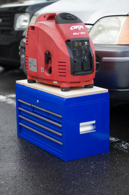 2台積む時は2つのホイールクランプの間に発電機を置くのだけど、今までよりも少しずつ間隔を開いたら縦に工具箱が入ったので、その上に発電機。