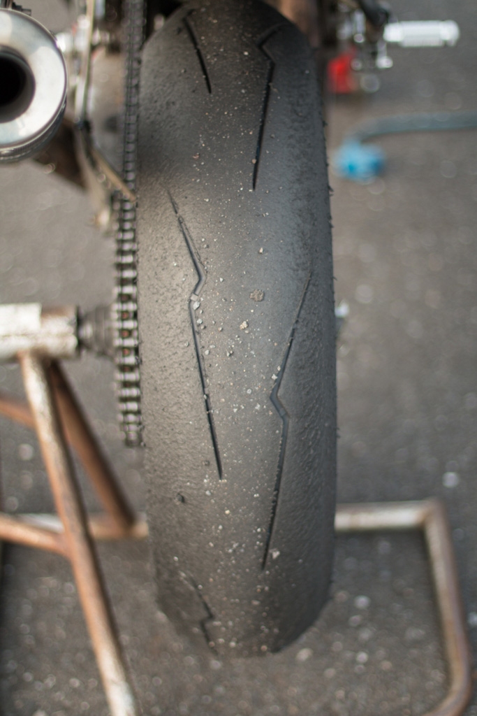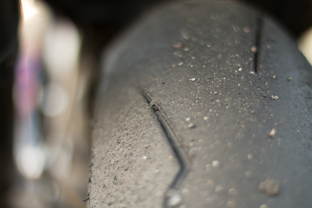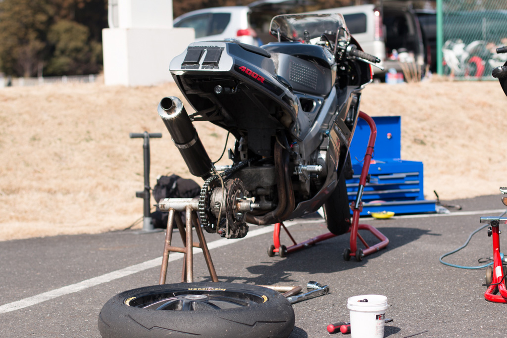 良く考えてみるともう3時間以上履いてるタイヤで、右側は特にキテるのでとりあえず逆履きしとくか!ってんで、ちょうど昼休みに突入する時間だったので逆履きの儀。