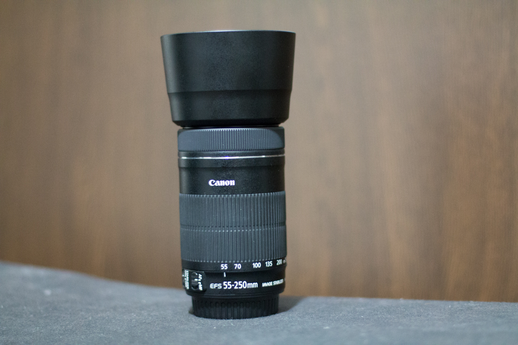 全然関係ないんですけども、さっき55-250mmのレンズを撮ってみたら、白い文字が赤っぽくなったり輪郭が変に発色したりするような感じになって、それが気になって気になって…っつぅか気に入らないので三脚を出して来てISOとかF値とかシャッタースピードとか、何度も何度も試してたかがレンズフードを撮るのに15分も掛かった。