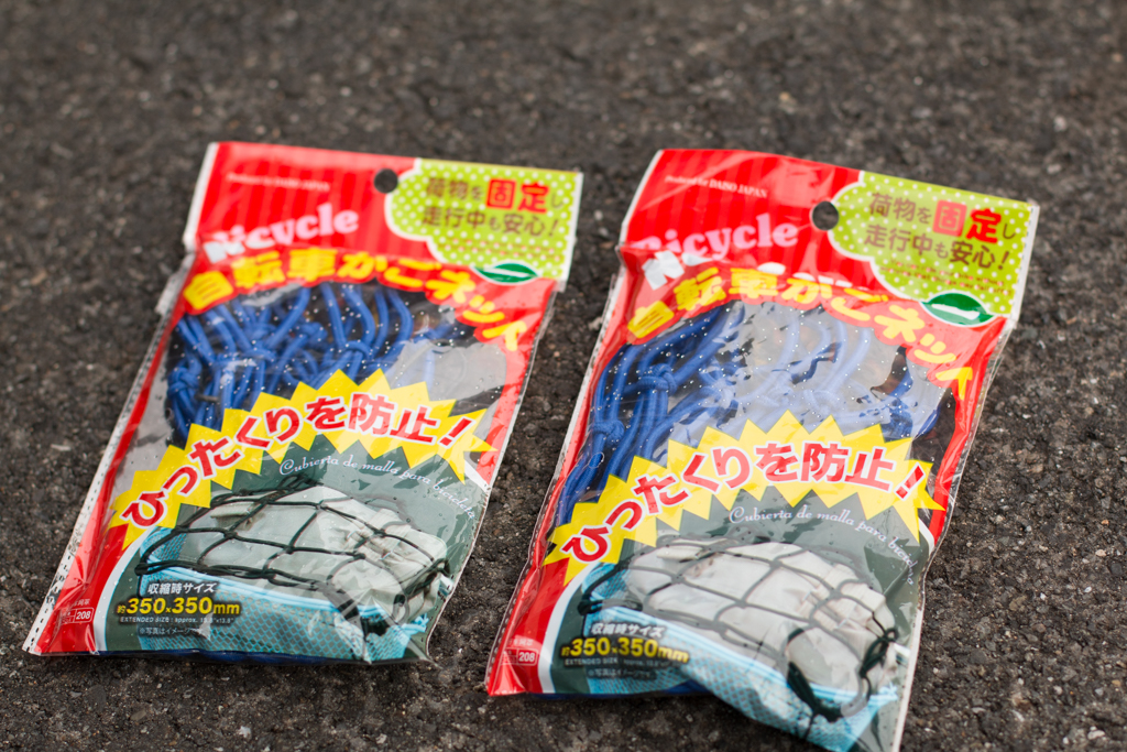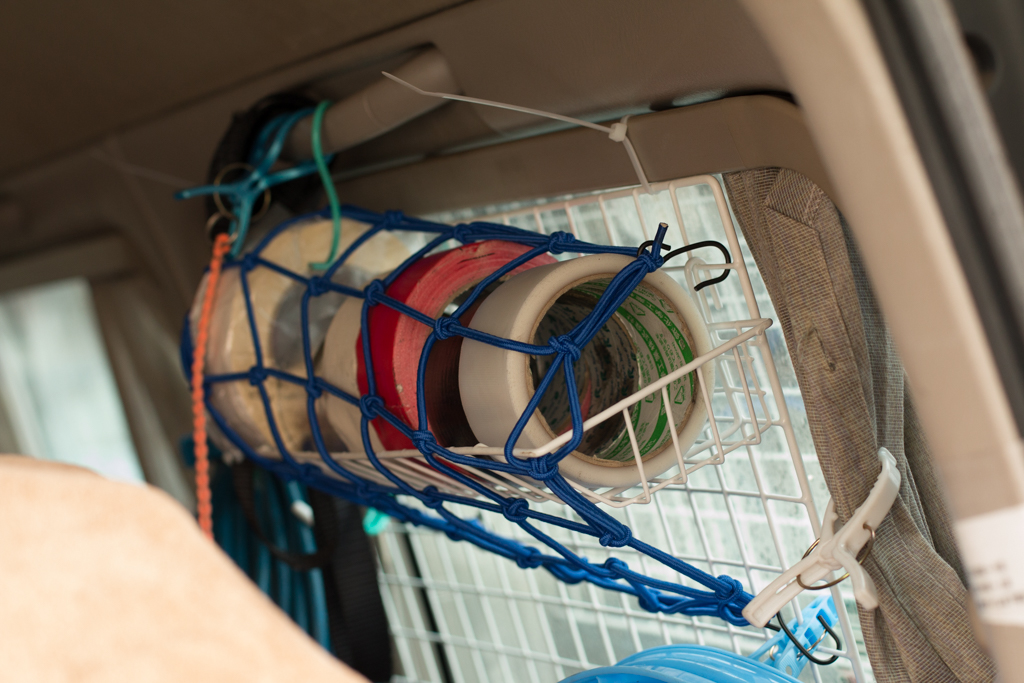 買ってみたら思ってたよりも大きかった工具箱なんですけども、なんだかんだと2台積みもまったく問題なかったものの、窓際に掛けてあるスプレー類とかテープ類が積む時にちょっと邪魔で、積む時は外しておけば良いって話しなんですけども、ちょっと前にOKRに行った時に社長から段差で飛び跳ねたりしたら車内でエラいことになるんで自転車のカゴのネットでも着けとけと言われてたのを思い出したので今日実行。