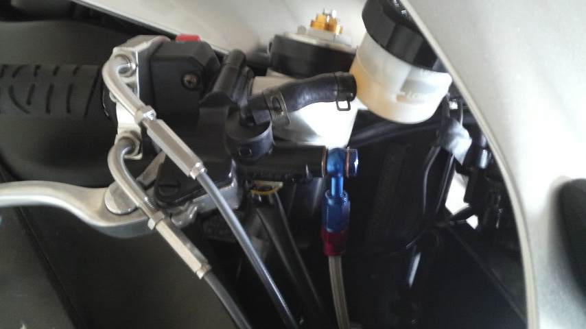 そんで今回購入したセミラジはリザーバーの取り出し口が真上を向いててフィッティングは真下に着いてるんで、取り出しホースは垂直でブレーキホースは水平に着くコトになる。