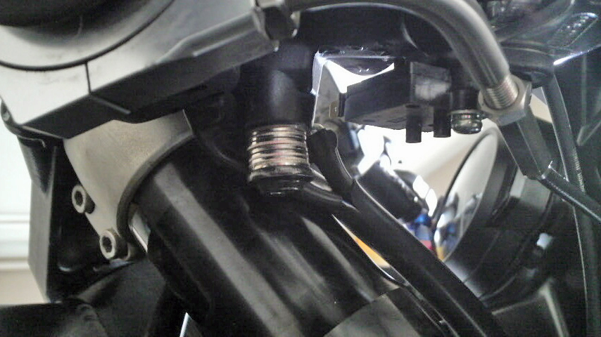 で、ハイスロを緩めてアレやコレやとガチャガチャしてセミラジを仮付けしてみたんですけども、一番の懸念はホースが水平に出るってコトはハンドルを左に切った時にカウルステーに干渉するんじゃなかろうか?ってトコだったのが、その前に微妙なコトを発見。