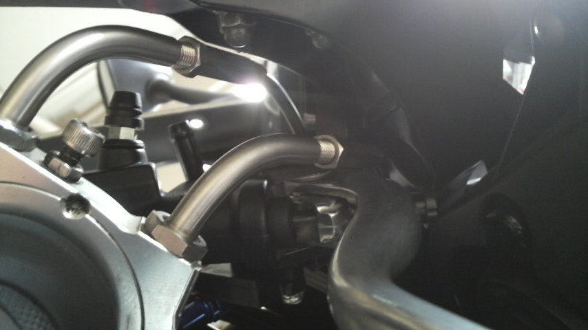 スペアパーツって訳じゃなし、せっかく買ったのに転がしてあるってのもなぁと思ってですね、考えてても仕方がないので仮付けだけでもしてみてホースが干渉するとかストレスが掛かるとか、何か問題があるようなら元に戻せば良いじゃないってコトで昼からガチャガチャやってみたんですわ。