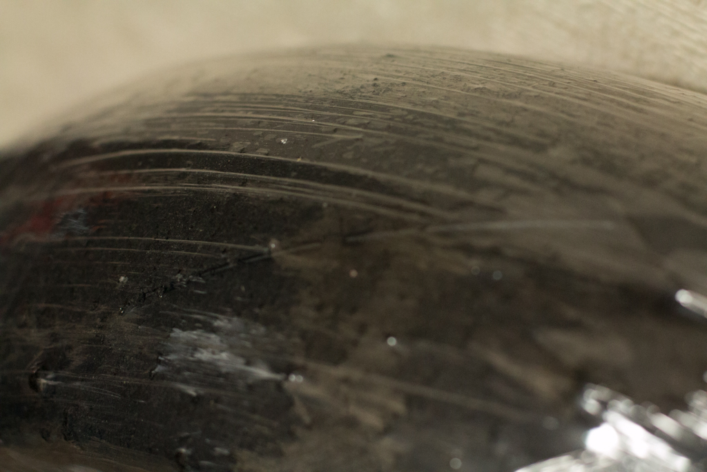 ラップ越しに見る感じ、左右ともスリップサインがツライチになるまであと0.5mmくらいはありそうに見える。