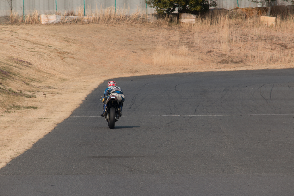 もう少し低い位置からコースの先を入れて撮ってみたいところなのだけど、トミンの最終は土手の上から狙うことになるので致し方なし。