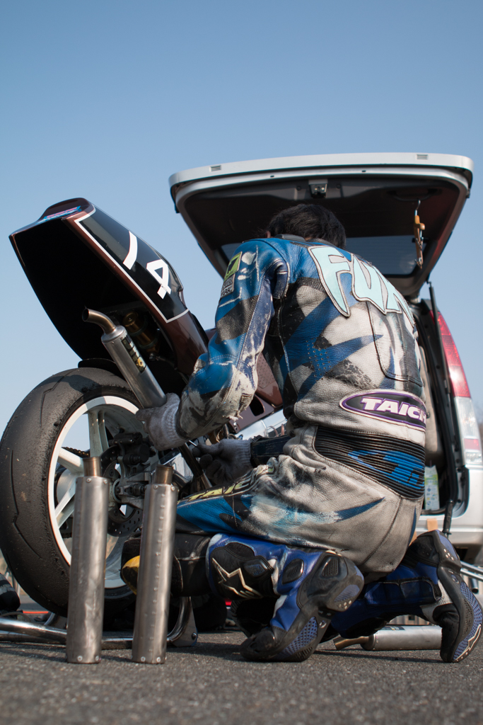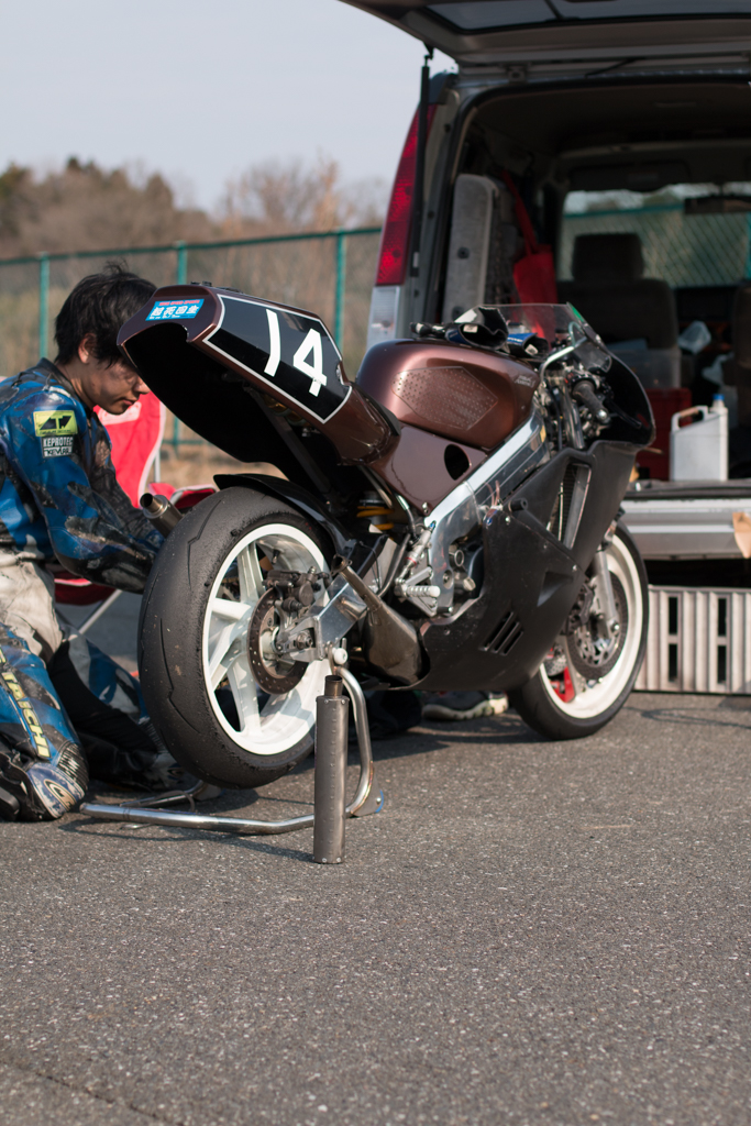 今回は走ってるところだけじゃなくて、バイクが停まってるところとかもいろいろ考えてバシャバシャやってたんですけども、トランポが隣りだったのを良いことに14番さんの作業中の写真とかを撮ってた時にですね。こういうの。