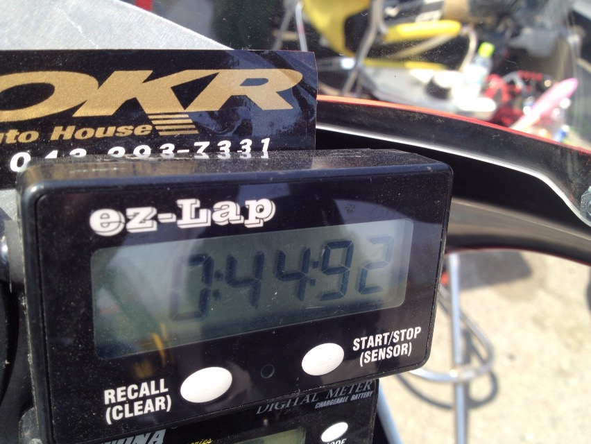 トミンと比べるとハードブレーキポイントが増えるんですけども、かなりガッツリブレーキングした時にリアが跳ねて暴れる以外は特に不満もないし、スプロケはもうちょいショートで立ち上がりを盛りたいところだけど、今日はこのまま走ることにしようかな…とか思いつつ、ふとラップタイマーを見てみると、45秒のいくつだかって表示されている。