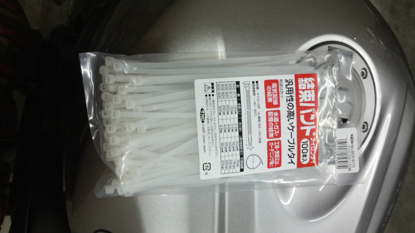 そりゃぁまぁ応急処置なんで仕方ないんですけど、それにしてももうちょっと何とかなんだろってコトで仕事の帰りに近所のスーパーのDIYコーナーでもう少し長いナイロンバンドを買って来ました。