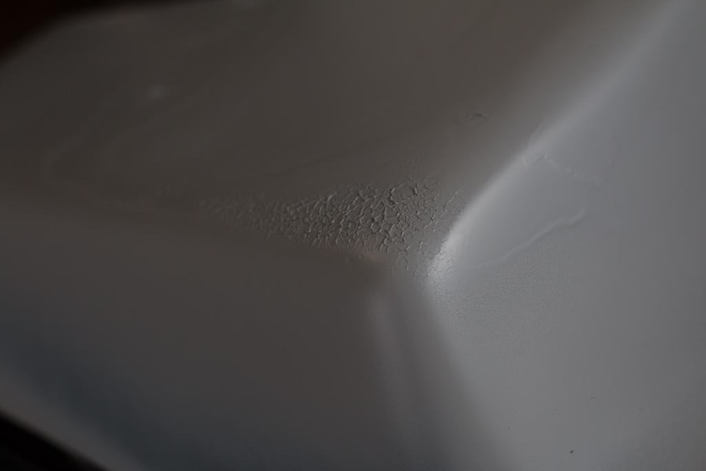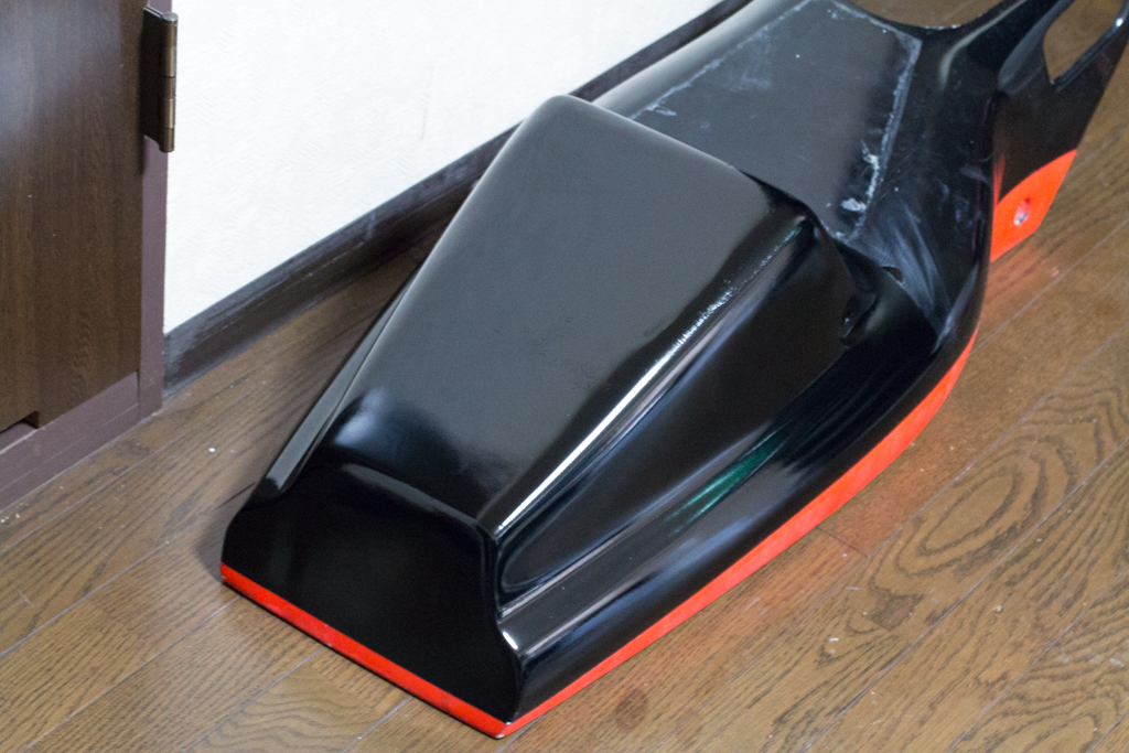 で、今回はカウルの上の部分にバッコリ穴が開いたのを塞いで色を塗るんですけども、穴を塞ぐとこまでは適当に終わらせてあって、あとは色を塗るだけ。