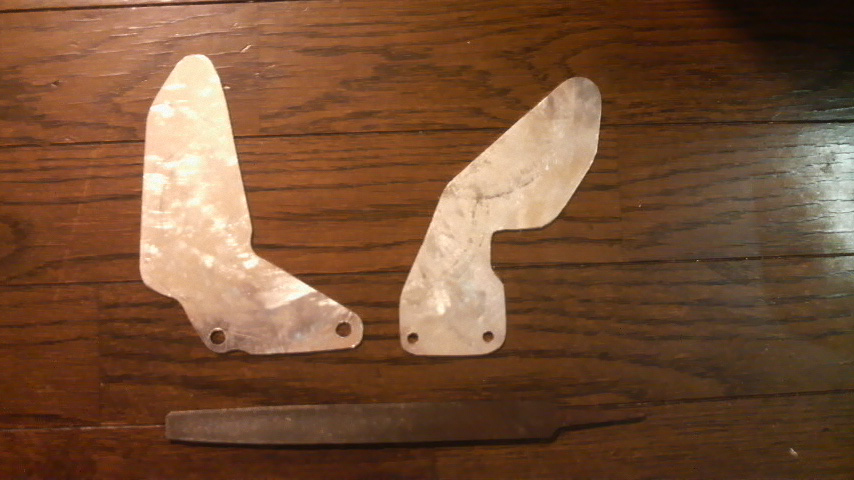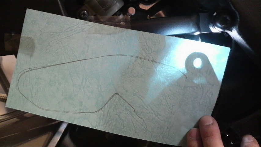 右のブレーキのロッドに踵が当たらないように試行錯誤しつつ、何枚か書き直したり切り直したりしたところ、最終的にはこんな感じのヘンテコな形に落ち着いた。