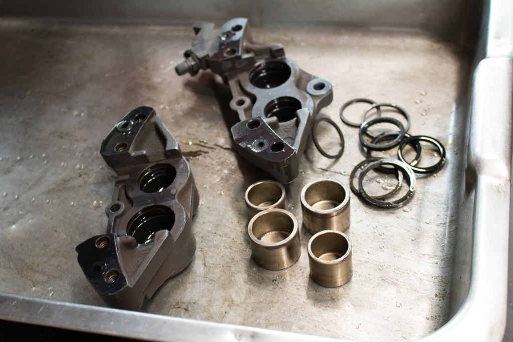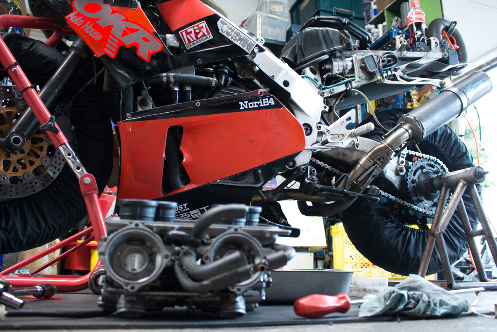 そういった訳で無事にVFRの整備を開始していただきまして、今日は主に先週の決勝でぶっつけ本番で挑んだセッティングを微妙にハズして上が回らなくなってしまったのを、症状を細かく伝えてジェッティングを変更してもらったり、あとフロントの左キャリパーのピストンの動きがひとつどうにも渋くて揉み出ししてもすぐに引きずってしまうのでシール関係を全部交換してもらったりっていうメニューだったのですが…