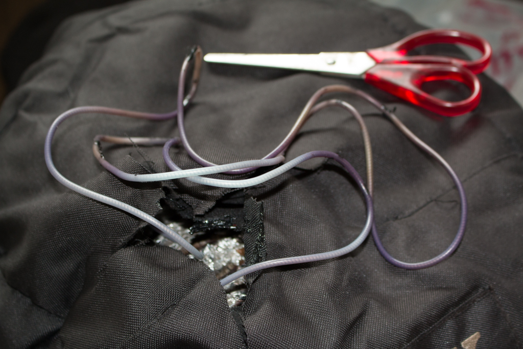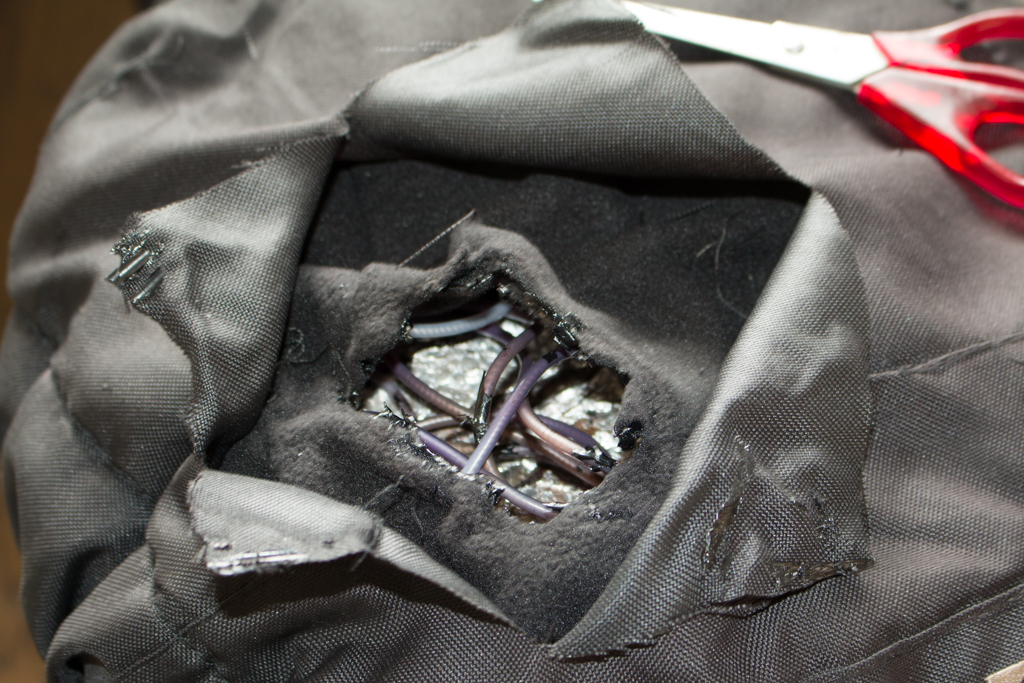 パッと見た感じ、5mmくらいの穴が空いてるだけなので、中で断線した線をちょっとハンダで繋いでやれば良いだろ♪くらいに思ってハサミを入れようとすると、穴を中心に何やらパリパリしている。