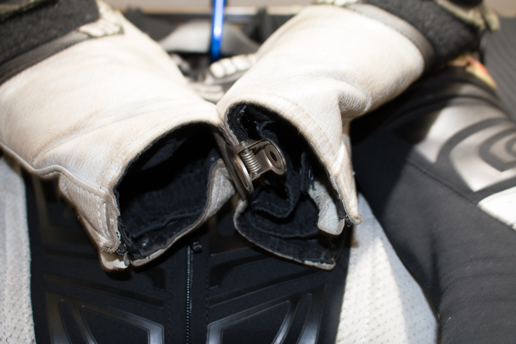 昔のペラッペラのツナギだったらこれでもうまったく問題なかったんですけども、最近のツナギにはコブがあったりプロテクターも立体的だったりして、ちょっとぶつかったり揺れたりするとすぐにズリッと肩から外れてしまう。