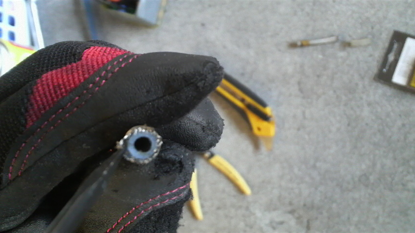 切断時にテフロンホースが潰れるので中を傷つけないように何か突っ込んでホースを丸く戻しておく。自分の場合は六角レンチの先がボールっぽくなってるヤツを突っ込んでます。
